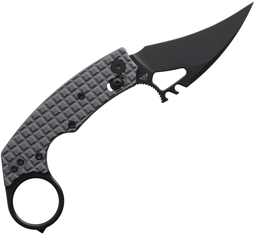 4.38" (11.13cm) closed. 3" (7.62cm) black PVD coated 14C28N Sandvik stainless karambit blade. Gray sculpted aluminum handle. Glass breaker. Finger ring. Thumb pull. Pocket clip. Boxed.