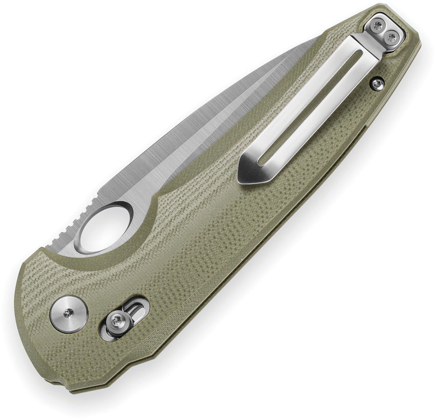 5.15'' closed. 3.71'' Satin finish 14C28N steel drop point blade. OD Green G10 handle. Crossbar Lock. Thumb slot. Tip-Up reversible pocket clip. Ceramic ball bearing. Designed by Grzegorz Grabarski. Boxed.