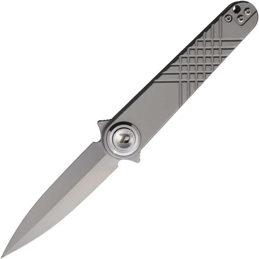 4.25" (10.8cm) closed. 3.25" (8.26cm) bead blast finish false edge 14C28N Sandvik stainless dagger blade. Gray textured titanium handle. Extended tang. Pocket clip. Lanyard hole. Boxed.