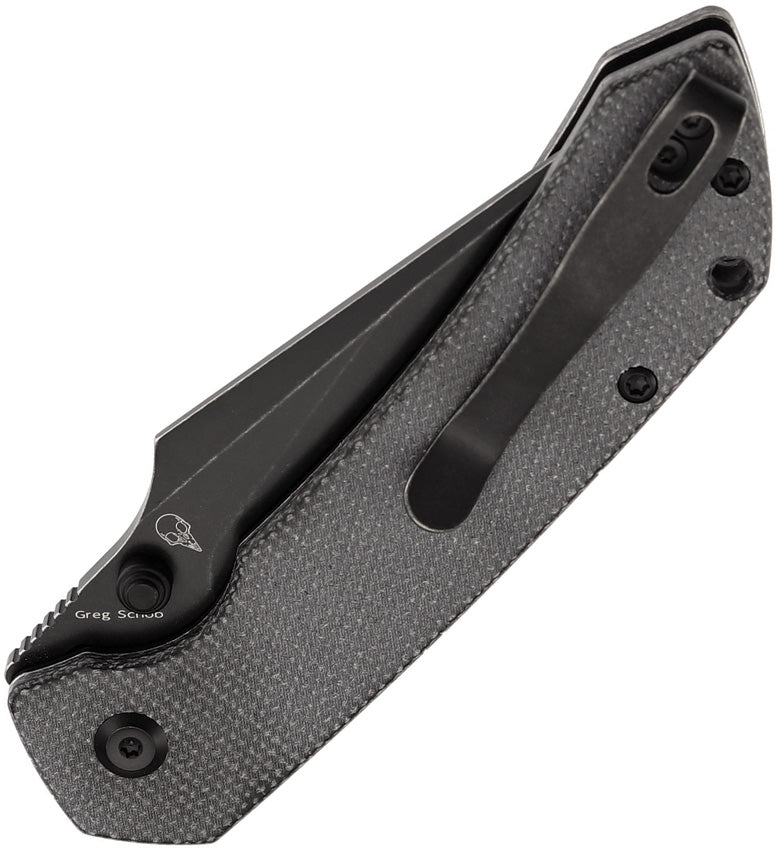 4.5" (11.43cm) closed. 3.5" (8.89cm) black stonewash finish 14C28N sandvik steel harpoon style blade. Black canvas micarta handle. Button Lock. Dual sided thumb studs. Lanyard hole. Tip-Up reversible pocket clip. Boxed.