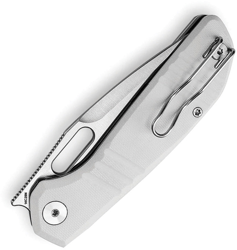 4.4'' closed. 3.4'' Satin finish Sandvik 14C28N steel drop point blade. White G10 handle. Linerlock. Thumb slot. Front flipper. Tip-Up reversible wire pocket clip. Ceramic ball bearing. Boxed.