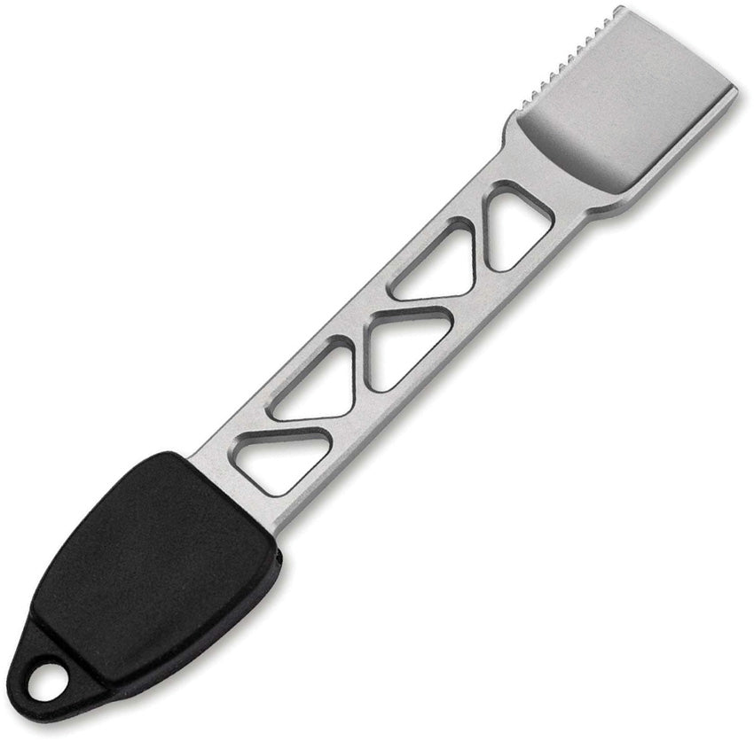 3.35" overall. Weight: 1.45oz. Features fork, spoon, and knife. Bead blasted and titanium PVD coated finish 420J2 stainless steel construction. Black plastic sheath with lanyard hole. Boxed.
