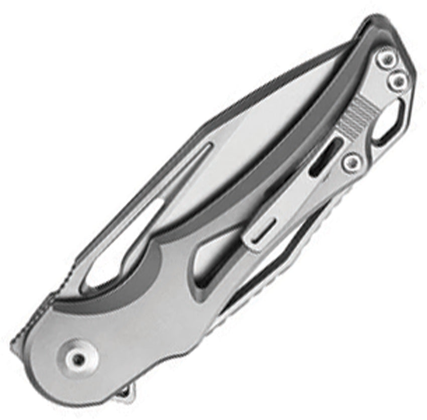 4.88" (12.4cm) closed. 3.63" (9.22cm) satin finish Bohler M390 stainless modified tanto blade. Gray titanium handle. Extended tang. Thumb pull. Lanyard hole. Pocket clip. Black nylon zippered storage case. Boxed.