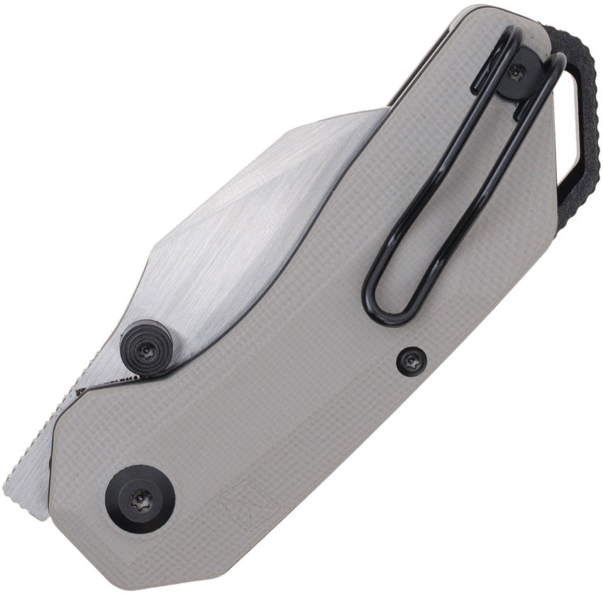 2.79'' closed. 1.64'' Satin finish 14C28N steel blade. Gray G10 handle. Button Lock. Lanyard Hole. Tip-Up reversible pocket clip. Dual sided thumb studs. Front flipper. Ceramic ball bearing. Designed by Felix Danishwara. Boxed.