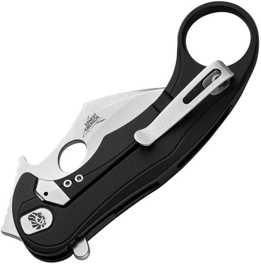 4.5" (11.43cm) closed. 2.25" (5.72cm) stonewash finish Bohler M390 stainless karambit blade. Black aluminum handle. Thumb pull. Extended tang. Finger ring. Pocket clip. Boxed.