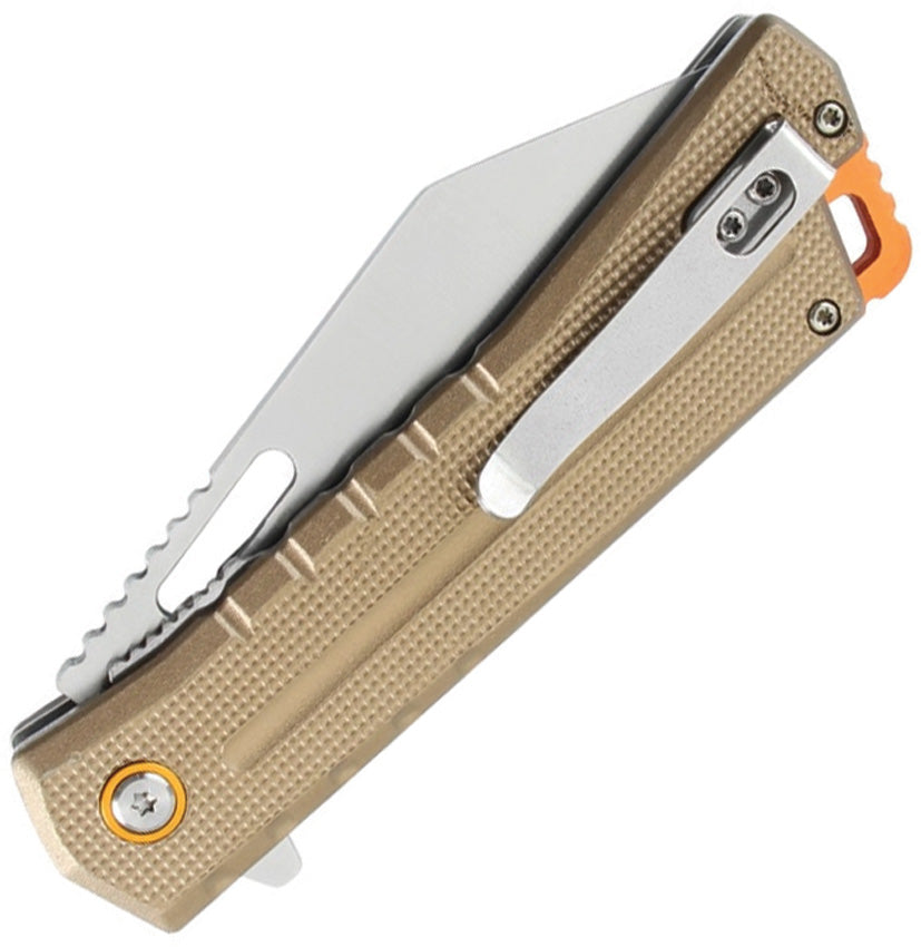 Assisted opening. 4.75" (12.07cm) closed. 3.5" (8.89cm) satin finish 3Cr13MoV stainless clip point blade. Tan anodized aluminum handle. Extended tang. Thumb pull. Lanyard hole. Pocket clip. Boxed.