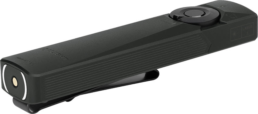 Dimensions: 4.72" x 0.63" x 1.06". Water resistant. Impact resistant. Rechargeable. Strobe. Cool white LED. Green laser. UV light. Modes: Turbo (1400-420 lumens, 4+121m runtime); High (420-100 lumens, 135+12m runtime); Medium (100 lumens, 9h 45m runtime); Low (15 lumens, 55h runtime); Moon (1 lumen, 11 days runtime). MCC1A magnetic USB charging. 103m beam distance. Requires (1) Lithium battery (included). Aluminum construction. Color: Stealth gray. Boxed.
