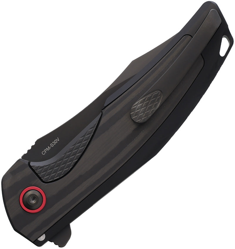 4.5" (11.43cm) closed. 3.5" (8.89cm) black DLC coated CPM-S30V steel clip point blade. Black aluminum handle with carbon fiber inlay. Extended tang. Lanyard hole. Pocket clip. Red accents. Boxed.