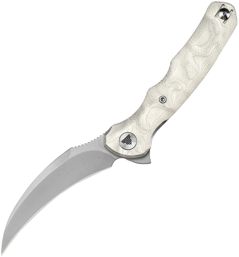 4.4'' closed. 3.34'' Sandblasted finish 14C28N steel karambit blade. Aluminum foil G10 handle. Linerlock. Ceramic ball bearing. Flipper Tab. Tip-Up reversible wire pocket clip. Designed by Tiguass. Boxed.