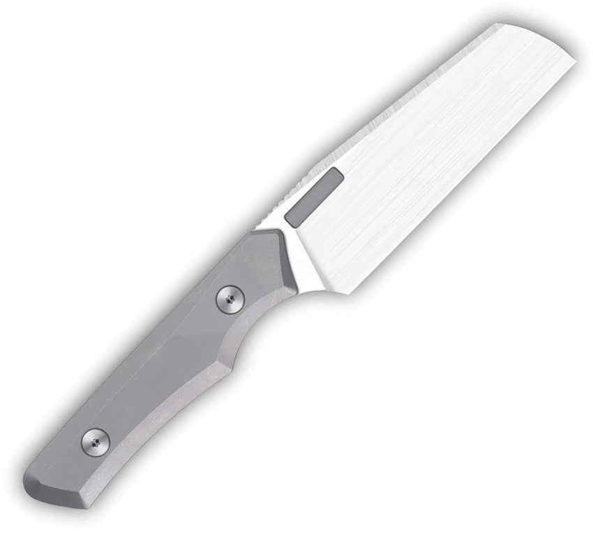 8.1" (20.57cm) overall. 4" (10.16cm) Hand satin finish Bohler M390 stainless cleaver style blade. Stonewash finish titanium handle. Full tang. Black Kydex belt sheath. Boxed.