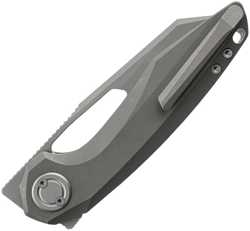 4.77'' closed. 3.49'' Two-tone acid washed and stonewashed finish Bohler M390 steel reverse tanto blade. Flat Grind. Dim gray titanium handle. Vanchor Lock. Flipper tab. Front flipper. Thumb slot. Lanyard hole. Caged ceramic ball bearing. Tip-Up right carry pocket clip. Designed by Yue. Boxed.