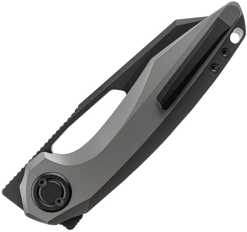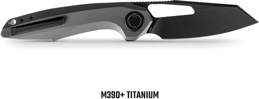 4.77'' closed. 3.49'' Black stonewashed finish Bohler M390 steel reverse tanto blade. Flat Grind. Dim gray titanium handle. Vanchor Lock. Flipper tab. Front flipper. Thumb slot. Lanyard hole. Caged ceramic ball bearing. Tip-Up right carry pocket clip. Designed by Yue. Boxed.