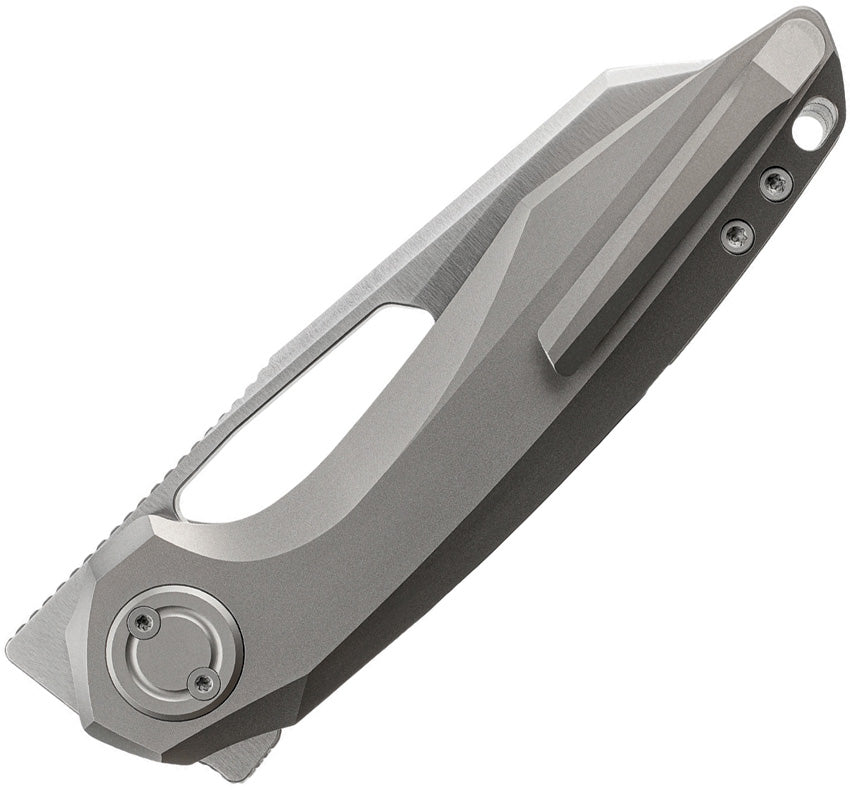 4.77'' closed. 3.49'' Satin finish Bohler M390 steel reverse tanto blade. Flat Grind. Gray titanium handle. Vanchor Lock. Flipper tab. Front flipper. Thumb slot. Lanyard hole. Caged ceramic ball bearing. Tip-Up right carry pocket clip. Designed by Yue. Boxed.
