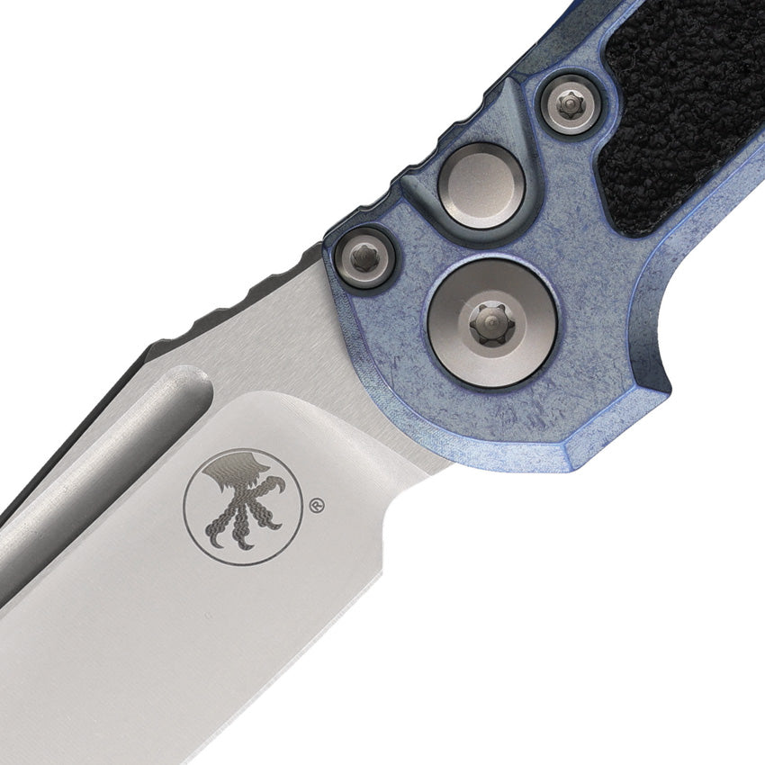 Microtech Automatic LUDT Marfione Select Button Lock Knife Ice Blue Titanium & Traction M390MK Tanto Blade 113610MS12