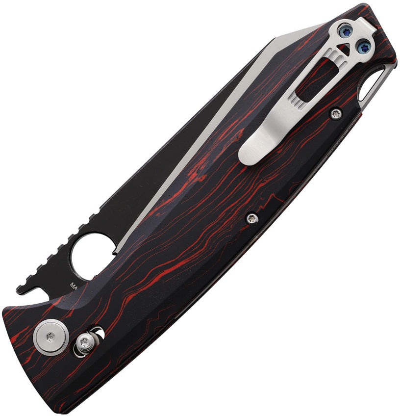 5.25" (13.34cm) closed. 4.25" (10.8cm) two-tone finish MagnaCut steel reverse tanto blade. Black and red G10 G-Mascus handle. Lanyard hole. Pocket clip. Thumb pull. Black nylon zippered storage case. Boxed.