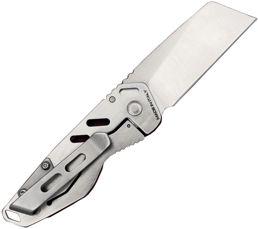 3" (7.62cm) closed. 2" (5.08cm) satin finish Bohler N690 stainless sheepsfoot blade. Cherry anodized aluminum handle with Satin stainless back handle. Lanyard hole. Pocket clip. Boxed.