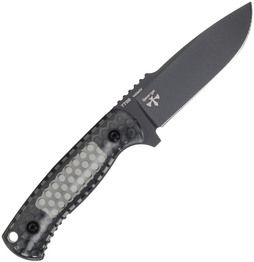 9" (22.86cm) overall. 4.25" (10.8cm) black finish 1095 Cro-Van carbon steel drop point blade. Smoked translucent polycarbonate handle. Full tang. Lanyard hole. Black molded plastic belt sheath. Designed by Les George. Boxed.