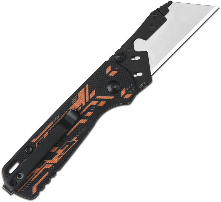 3.37'' closed. 2.3'' Black PVD coated finish blade. Orange and black mechanical design G10 handle. Button Lock. Lanyard Hole. Dual sided thumb studs. Tip-Up reversible pocket clip. Comes with 10 replacement blades. Boxed.