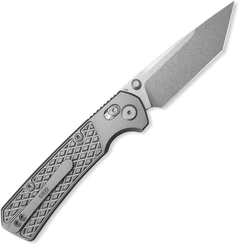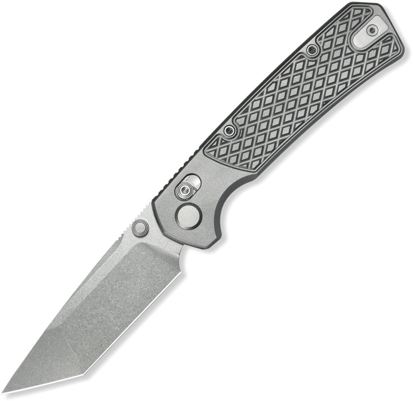 4.38" (11.13cm) closed. 3.38" (8.59cm) stonewash finish Bohler M390 stainless tanto blade. Gray textured titanium handle. Thumb stud. Pocket clip. Boxed.