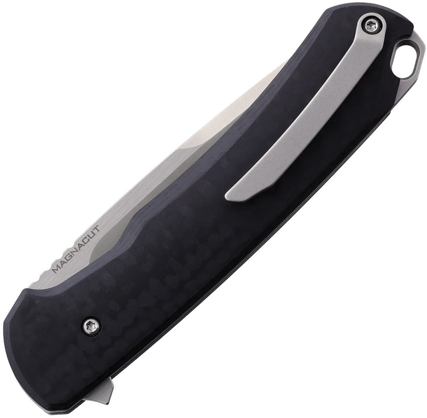 4" (10.16cm) closed. 3" (7.62cm) satin finish MagnaCut steel drop point blade. Black CarbonTex G10 handle. Extended tang. Lanyard hole. Pocket clip. Boxed.