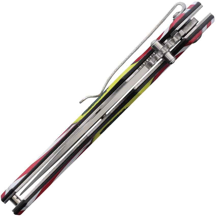 Assisted opening. 5" (12.7cm) closed. 3.75" (9.53cm) satin finish stainless blade. Aluminum handle. Extended tang. Thumb stud. Lanyard hole. Pocket clip. Don't Tread on Me and American flag artwork. Boxed.