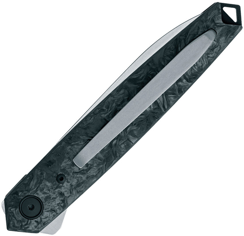 5.25" (13.34cm) closed. 3.75" (9.53cm) satin finish MagnaCut steel blade. Dark Matter carbon fiber handle. Extended tang. Lanyard hole. Pocket clip. Black nylon zippered storage case. Designed by Bob Terzuola. Boxed.