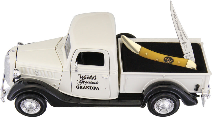 Inlay shield. Measures: 7.5" x 3" x 2.5". 1:24 scale diecast model of 1937 Ford Pick-up. Has steerable wheels and rubber tires. Detailed interior, exterior and engine compartment. Made of diecast metal with some plastic parts. World's Greatest Grandpa artwork on side panel. Comes with Texas Toothpick pocket knife with stainless long clip blade. Boxed.