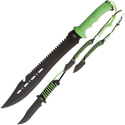 Blade: Stainless l Standard Edge l Black Finish; Other Info: 25" overall machete with 17.5" blade. Green ABS handles. Full, extended tang with lanyard hole. 10" overall bowie with 5" blade. One piece stainless construction with cord wrapped handle. Two 7.5" overall throwing knives with 3" blade. One piece stainless construction with cord wrapped handle. Black nylon belt sheath with shoulder strap holds all. Boxed.