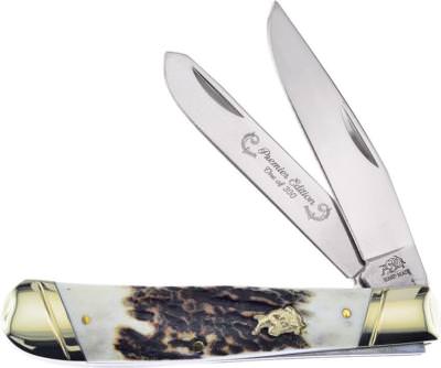Bulldog. 4.13" closed. Mirror finish stainless clip and spey blades. Deer stag handle. Nickel silver bolster(s). Inlay shield. Boxed.