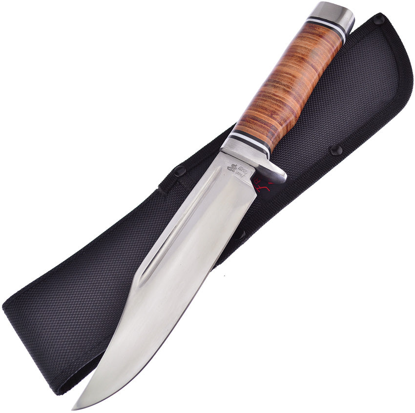 11.63" overall. 6.5" satin finish stainless clip point blade. Brown stacked leather handle. Stainless guard and stainless pommel. Black nylon belt sheath. Boxed.