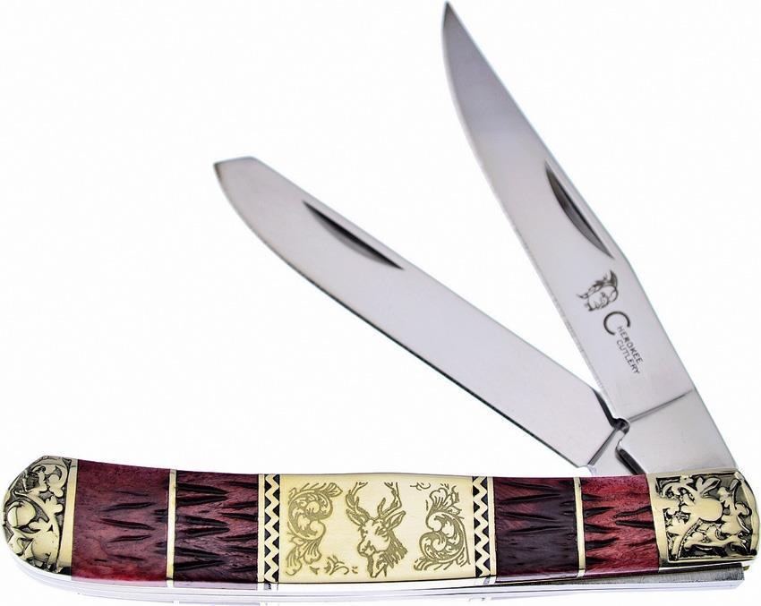 Cherokee Stone Works. 4.13" closed. Mirror finish stainless clip and spey blades. Whiskey jigged bone handle. Nickel silver bolster(s). Stainless inlay with deer artwork. Boxed.