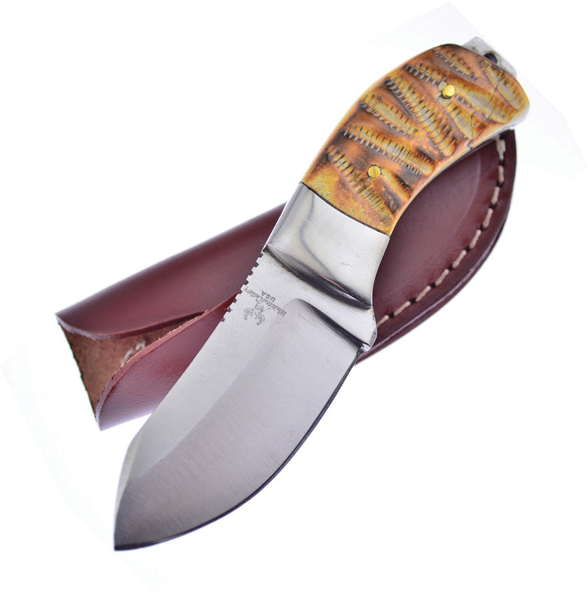 Whitetail Cutlery. 5.88" overall. 2.75" satin finish stainless blade. Chickasaw bone handle. Stainless guard. Full, extended tang. Lanyard hole. Brown leather belt sheath. Boxed.