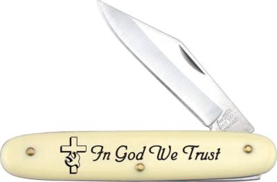 Novelty Knife. 3.38" closed. 2.38" satin finish stainless clip blade. Yellow synthetic handle. In God We Trust handle artwork. Bulk packed.