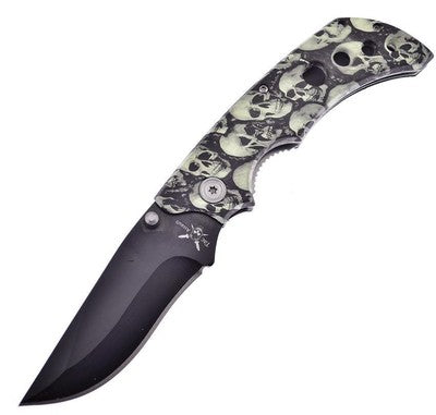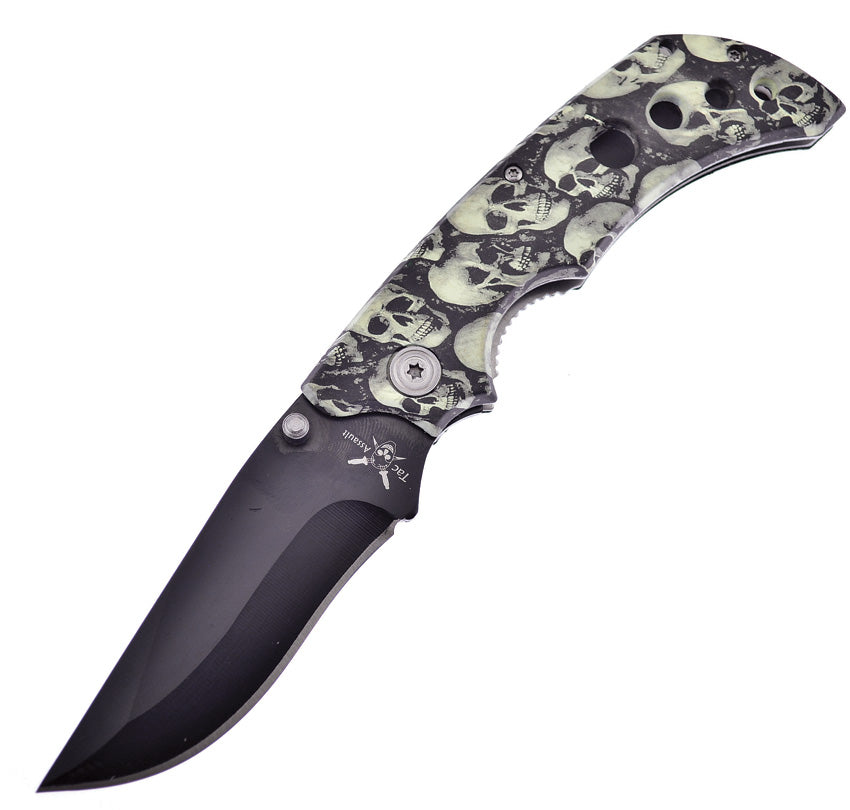 Tac Assault. Linerlock. Assisted opening. 5" closed. 3.5" black finish stainless drop point blade. White camo ABS handle. Lanyard hole. Pocket clip. Thumb stud. Skull camo handle. Boxed.