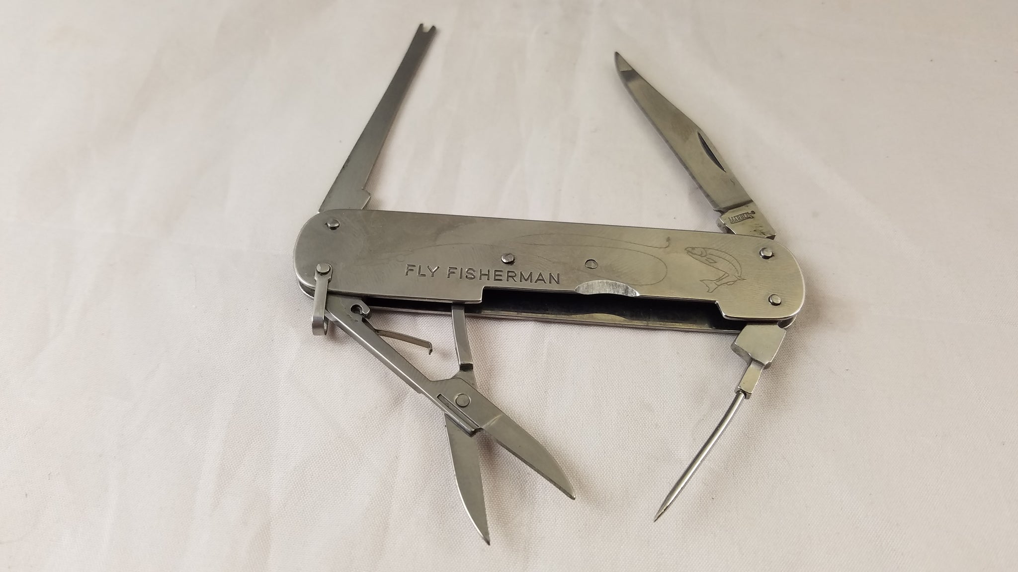 Marbles Fly Fisherman Knife - 3 7/8" closed. Stainless clip blade, file with hook remover, scissors, ruler, punch and shackle. Polished stainless handles with fly fisherman artwork. Comes boxed.
