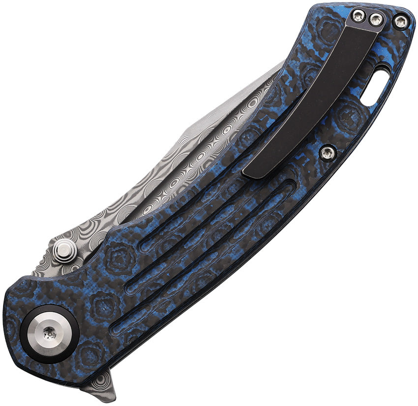 5.2'' closed. 3.6'' Damascus steel drop point blade. Flat Grind. Blue rose carbon fiber handle. Linerlock. Tip-Up right carry pocket clip. Lanyard Hole. Dual sided thumb studs. This knife was designed by Kmaxrom Design. Black nylon pouch. Boxed.