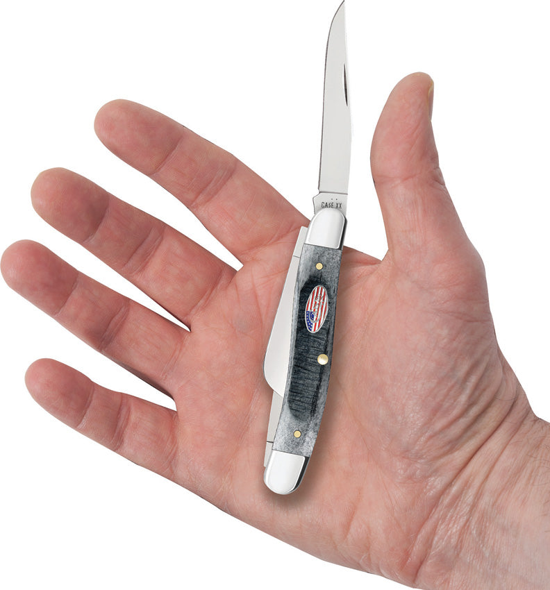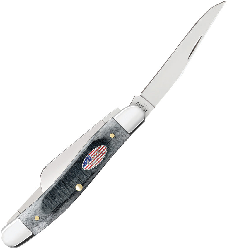 6318 SS pattern. 3.63" (9.22cm) closed. Mirror finish stainless clip, sheepsfoot, and spey blades. Gray sawcut bone handle. Nickel silver bolster(s). Stars and stripes inlay shield. Boxed.