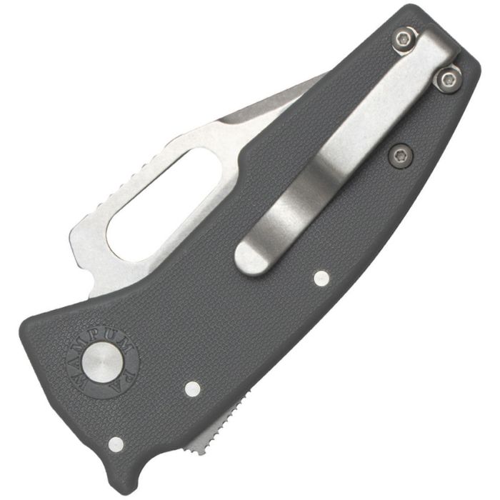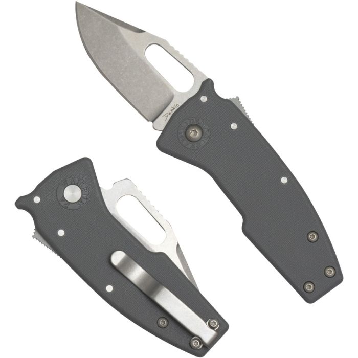 3.75'' closed. 2.125'' Stonewashed finish AUS-10A steel clip point blade. Flat Grind. Gray GRN handle. Shark-Lock. Thumb slot. Tip-Up reversible pocket clip. Designed by Andrew Demko. Boxed.
