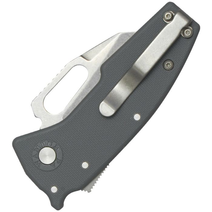 3.75'' closed. 2.125'' Stonewashed finish AUS-10A steel shark foot blade. Flat Grind. Gray GRN handle. Shark-Lock. Thumb slot. Tip-Up reversible pocket clip. Designed by Andrew Demko. Boxed.