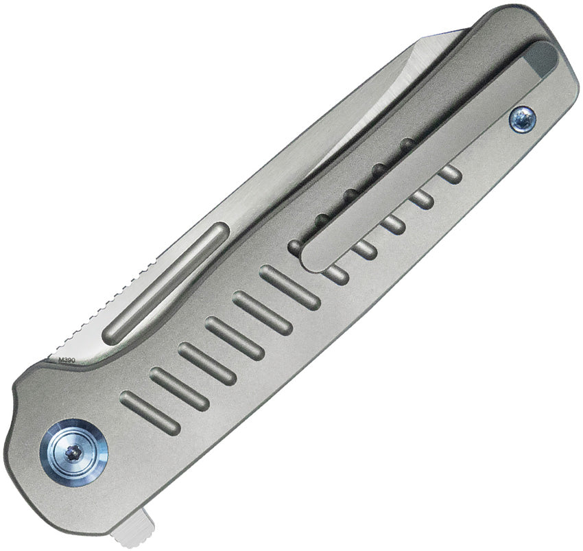 4.02'' closed. 3.15'' Belt satin finish Bohler M390 steel reverse tanto blade. Flat Grind. Gray 6AL4V titanium handle. Linerlock. Flipper tab. Caged ceramic ball beraing. Blue accents. Tip-Up right carry pocket clip. Designed by Mark Perez. Boxed.