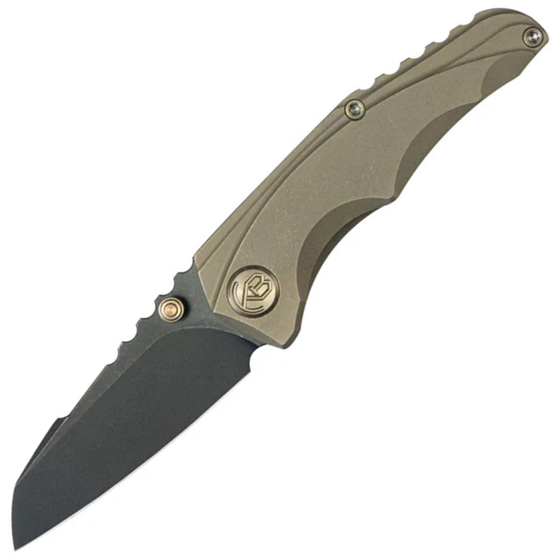 3.27'' closed. 2.36'' Blackwash finish Bohler M390 steel sheepsfoot blade. Flat Grind. Bronze 6AL4V titanium handle. Framelock. Dual sided thumb studs. Caged ceramic ball bearing. Tip-Up right carry pocket clip. Designed by Kotowski Bartlomiej. Boxed.
