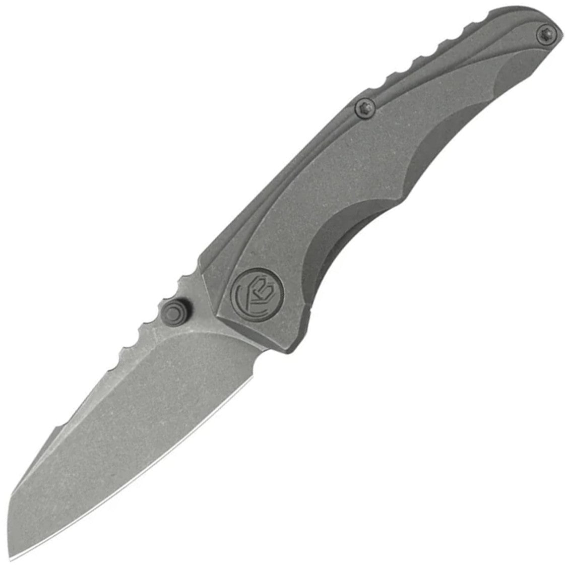 3.27'' closed. 2.36'' Two-tone acid etch and stonewash finish Bohler M390 steel sheepsfoot blade. Flat Grind. Darkwash 6AL4V titanium handle. Framelock. Dual sided thumb studs. Caged ceramic ball bearing. Tip-Up right carry pocket clip. Designed by Kotowski Bartlomiej. Boxed.