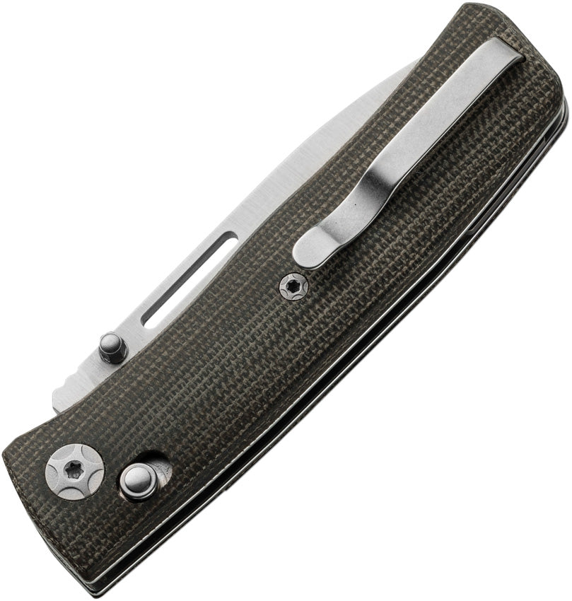 3.75" (9.53cm) closed. 2.63" (6.68cm) satin finish Bohler M390 stainless drop point blade. Green canvas micarta handle. Thumb stud. Pocket clip. Boxed.