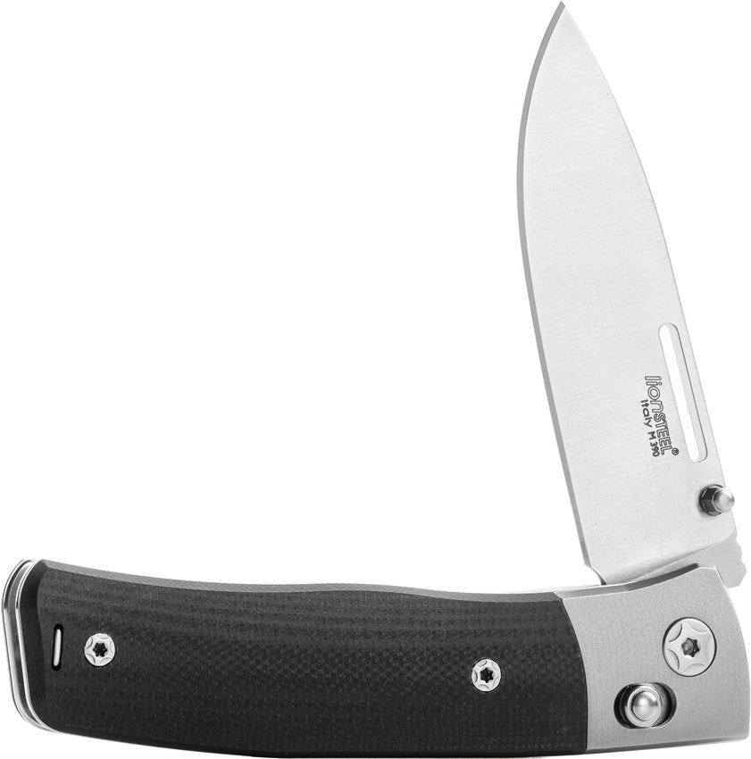 3.75" (9.53cm) closed. 2.63" (6.68cm) satin finish Bohler M390 stainless drop point blade. Black G10 handle. Titanium bolster(s). Thumb stud. Pocket clip. Boxed.