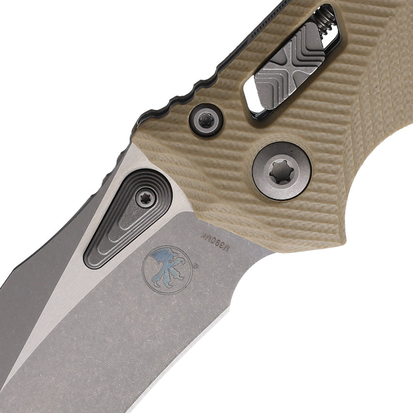 5.38" (13.67cm) closed. 4" (10.16cm) Apocalyptic finish Bohler M390MK steel blade. Tan fluted G10 handle. Pocket clip. Lanyard hole. Unique thumb stud opener with ball bearing pivot. Microtech item #137RL-10APFLGTTA. Boxed.