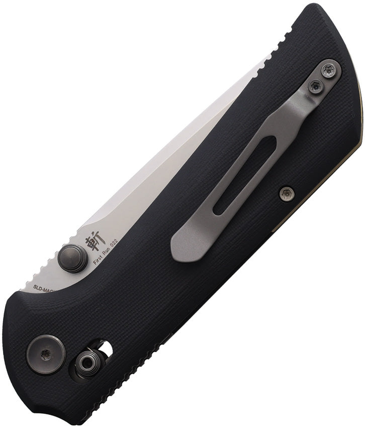 4.75" (12.07cm) closed. 3.75" (9.53cm) SLD-Magic steel tanto blade. Black G10 handle. Thumb stud. Pocket clip. Gold finish backspacer. Black molded plastic storage case. Boxed.