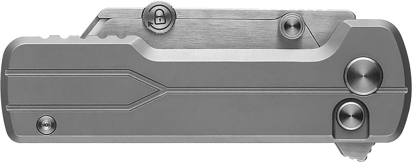 3.38" (8.59cm) closed. 2" (5.08cm) blade. Gray bead blast finish titanium handle. Extended tang. Thumb stud. Pocket clip. Quick blade change mechanism. Replaceable blade. Boxed.