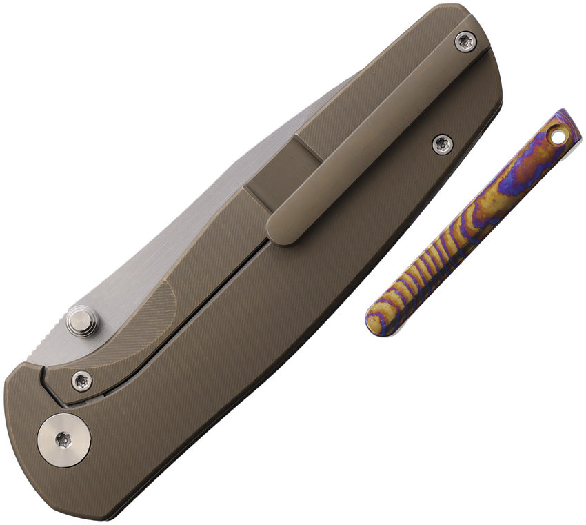 4.5" (11.43cm) closed. 3.75" (9.53cm) satin finish Bohler M390 stainless blade. Bronze stonewash finish titanium handle. Thumb stud. Pocket clip. Comes with additional Timascus pocket clip. Boxed.
