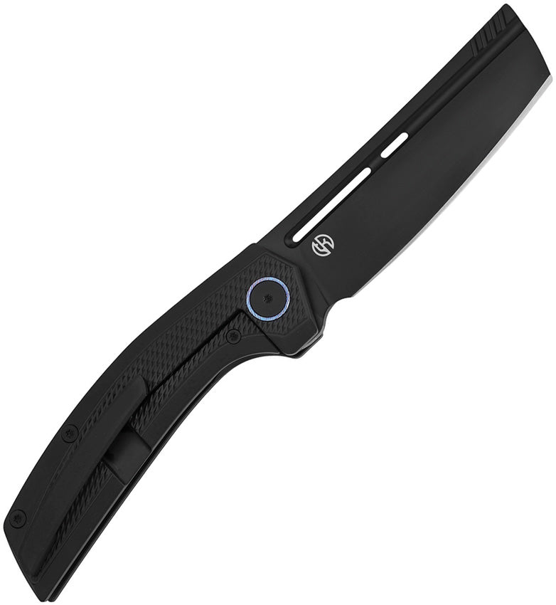 4.5" (11.43cm) closed. 3.63" (9.22cm) black DLC coated Bohler M390 stainless cleaver style blade. Black DLC coated titanium handle with Timascus inlay. Pocket clip. Boxed.