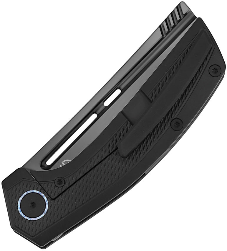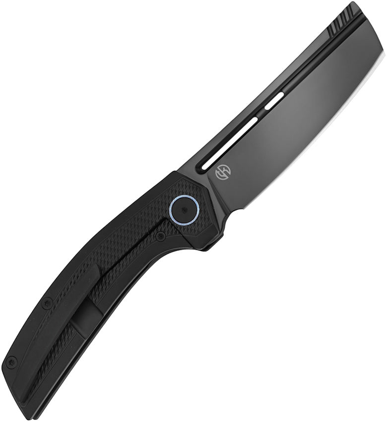 4.5" (11.43cm) closed. 3.63" (9.22cm) Black semi mirror polished finish Bohler M390 stainless cleaver style blade. Black DLC coated titanium handle. Pocket clip. Boxed.